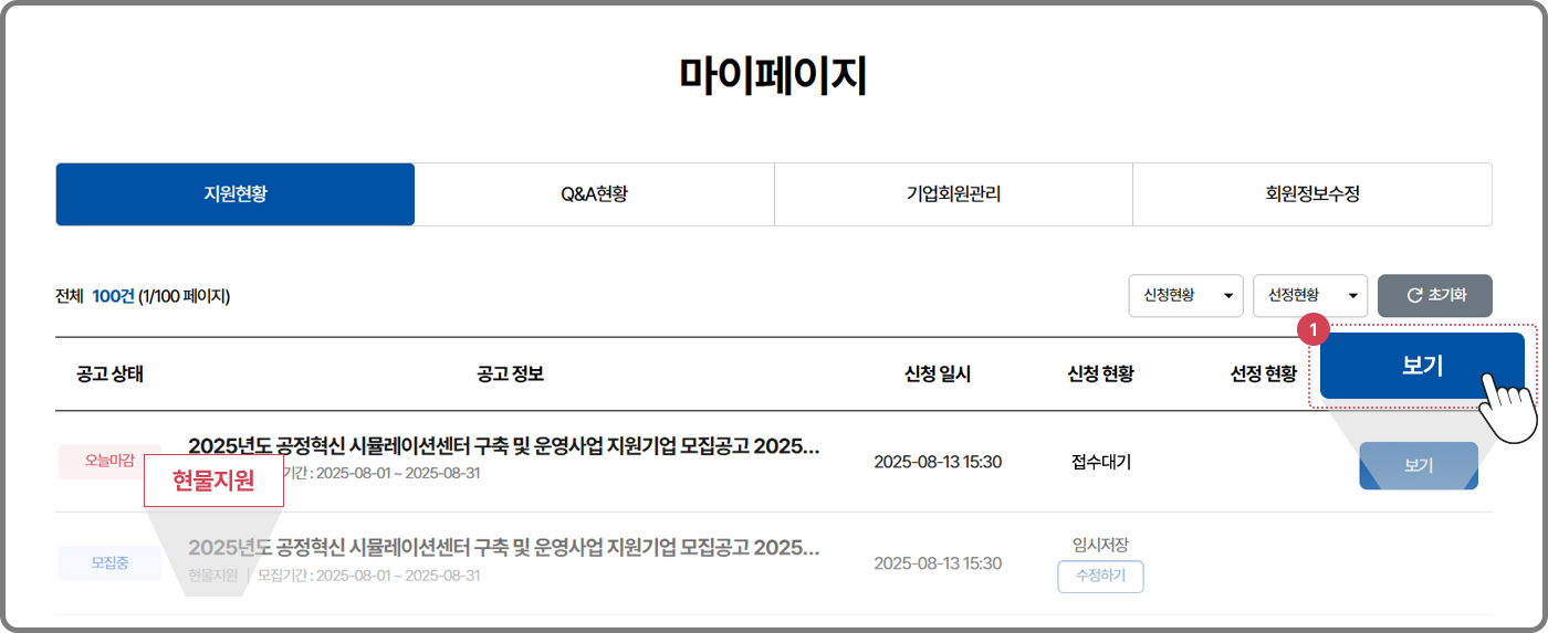 - 지원사업에 선정된 경우 지원사업 공고 목록에서 상세 페이지로 이동하여 선정 현황을 확인할 수 있습니다.
