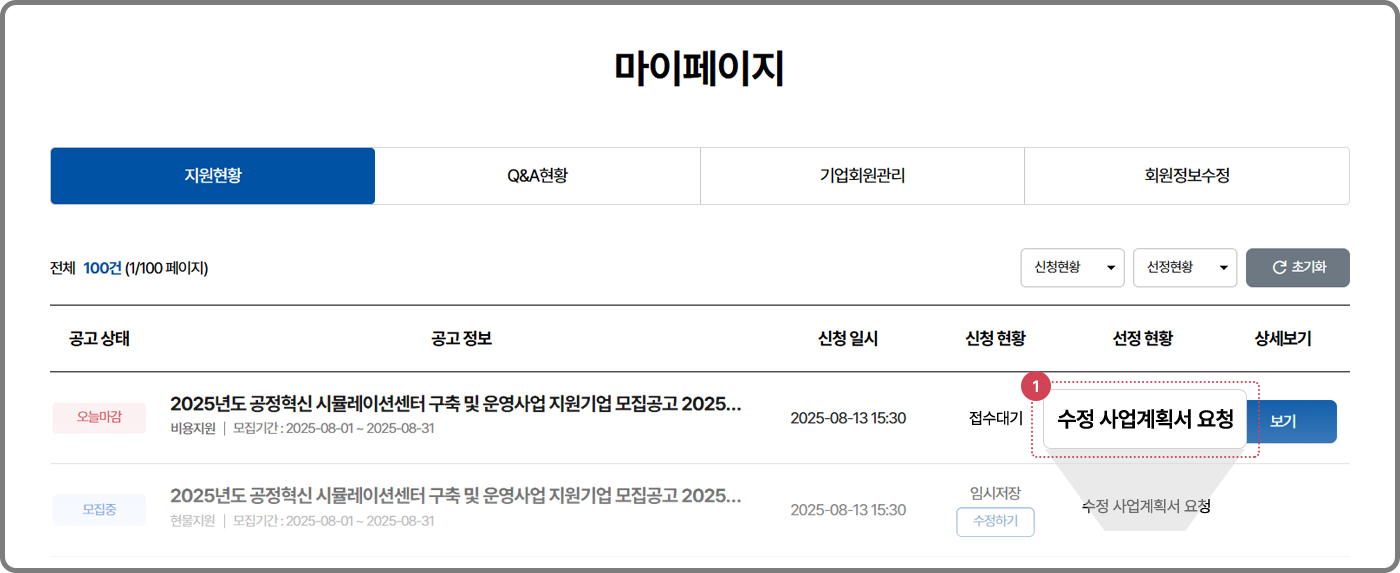 - 관리자가 수정 사업계획서를 요청하면 선정 현황이 ‘수정 사업계획서 요청’으로 바뀝니다. 상세로 이동하여 내용을 확인할 수 있습니다.