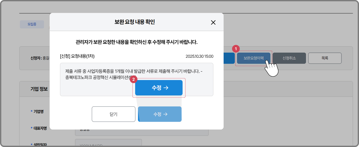 - 보완요청이력 버튼을 선택하면 상세 보완 요청 내용에 대해 확인할 수 있습니다.