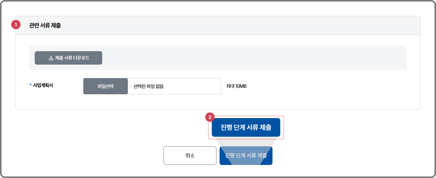 - 서류를 첨부한 후 진행 단계 서류 제출 버튼을 선택하여 제출을 완료합니다.