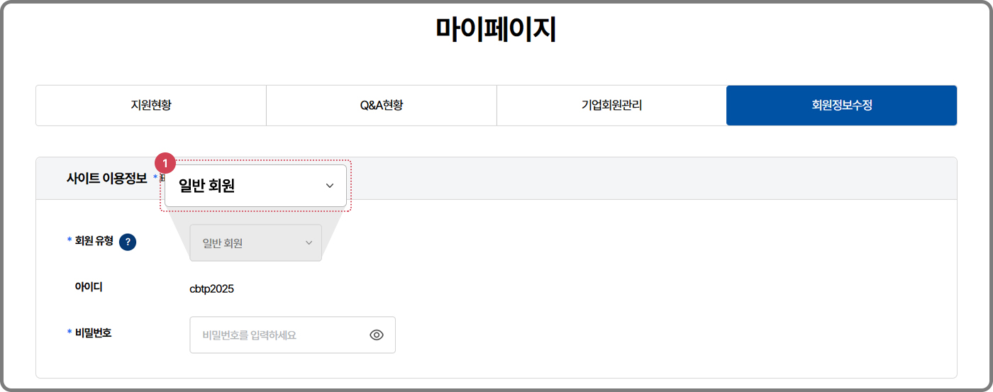 마이페이지 > 회원정보수정 페이지에서 ‘일반 회원’인지 확인합니다.
