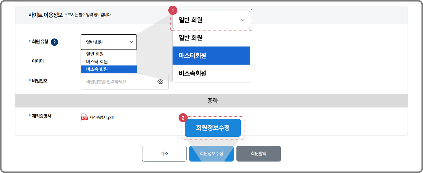 회원정보수정 버튼을 선택하여 마스터 회원 권한을 요청합니다.(관리자의 승인 후 변경됩니다.)